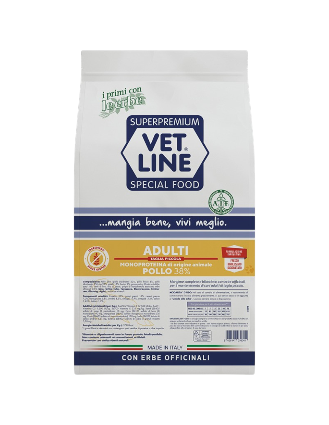 Realizzata per cani di taglia piccola a partire dalla forma della crocchetta, nel contenuto utilizza carni di pollo fresco, idrolizzato e disidratato, per soddisfare i palati più raffinati e raggiungere un valore più alto di energia metabolizzabile. La fonte glucidica è in linea con tutta la gamma priva di glutini e lieviti per evitare problemi d’intolleranze derivanti dalle proteine del glutine. Tali accorgimenti non sono sufficienti per risolvere i casi più gravi, per i quali sono state realizzate le formule ipoallergizzanti. L’integrazione di erbe officinali è analoga alle altre formulazioni per cani adulti.
