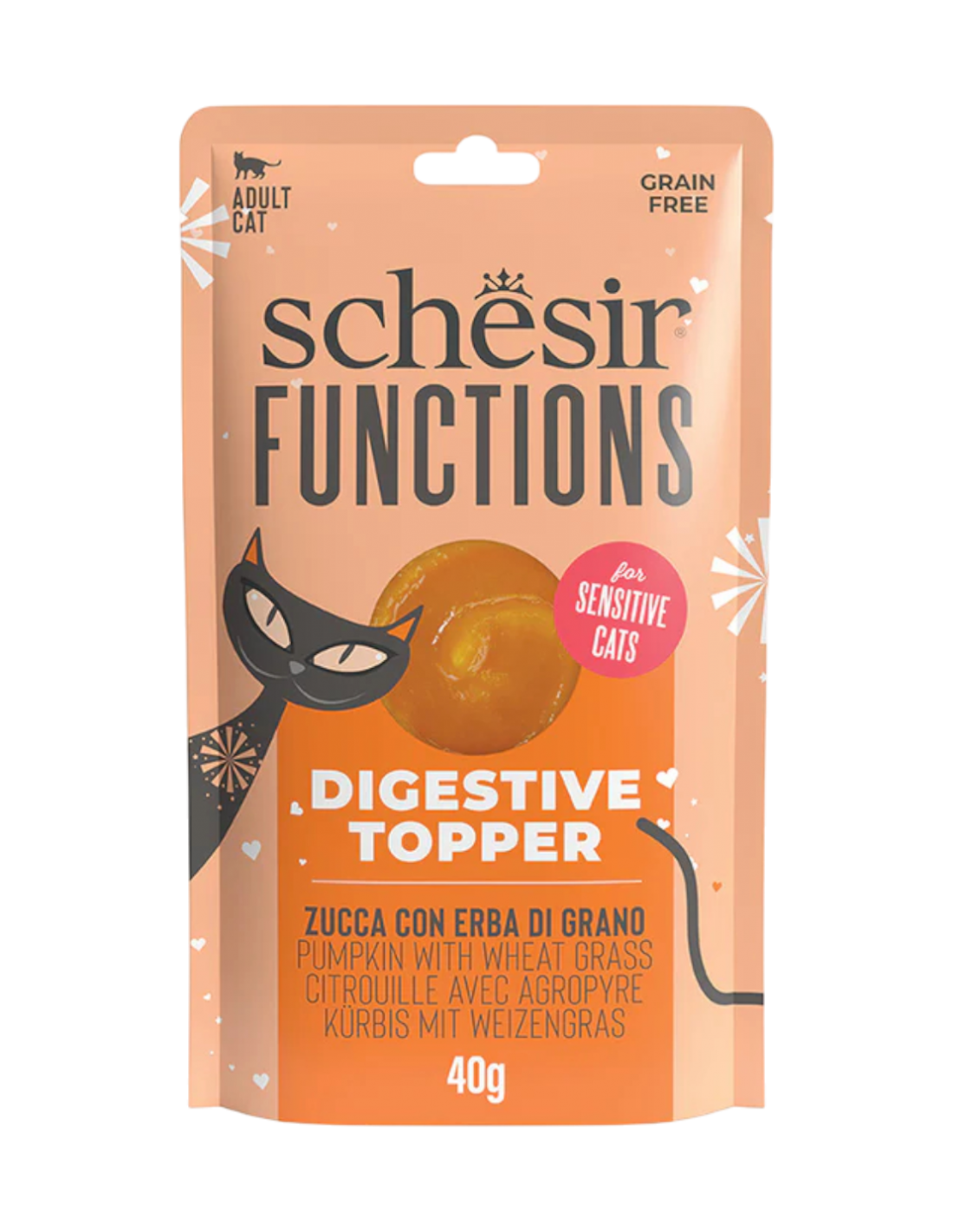 Topper funzionale supplementare, dalla ricetta semplice e la consistenza gradevole, a base di zucca frullata con aggiunta di erba di grano, per supportare i gatti con la digestione delicata.