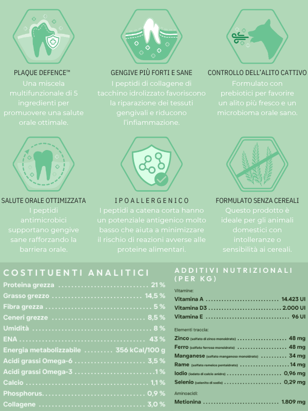 Garantisce un apporto ottimale di elementi costitutivi amminoacidici necessari per la produzione di peptidi antimicrobici che supportano la salute delle gengive rinforzando la barriera orale e riducendo l’infiammazione