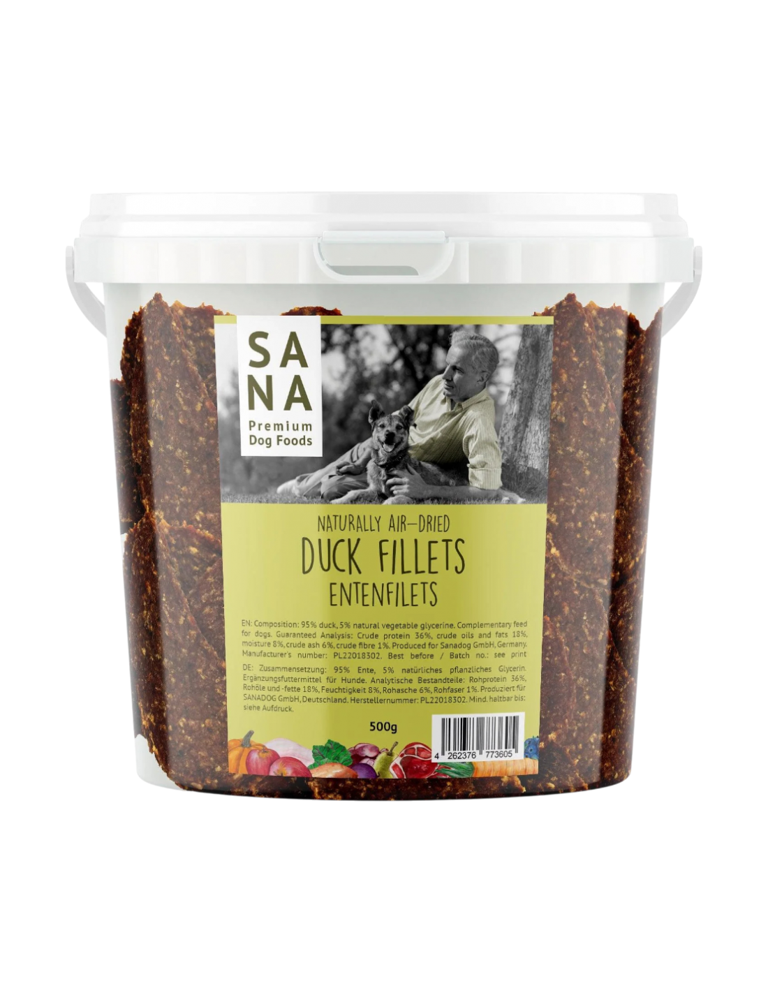 I filetti di anatra SANADOG sono una prelibatezza per il vostro cane a base di pura carne di anatra di alta qualità. Sono prodotti nel nostro stabilimento senza additivi come mais, grano, soia, coloranti, conservanti, farina di carne o altri riempitivi e sono delicatamente essiccati all'aria. La nostra tecnologia di essiccazione all'aria è un'interpretazione moderna di tecniche secolari di conservazione della carne.